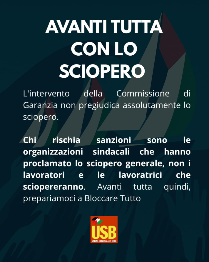 Il sindacato di base USB ha chiamato «ogni lavoratore e lavoratrice, ogni cittadino e cittadina, ogni organizzazione democratica e solidale a bloccare tutto: produzione, logistica, trasporti, scuola, servizi, in segno di protesta contro il crimine di guerra commesso da Israele e contro la complicità dei governi occidentali, Italia compresa, che continuano a fornire armi e sostegno politico al regime sionista. Difendere la Global Sumud Flotilla significa difendere la libertà, la pace, la dignità del lavoro e dei popoli».