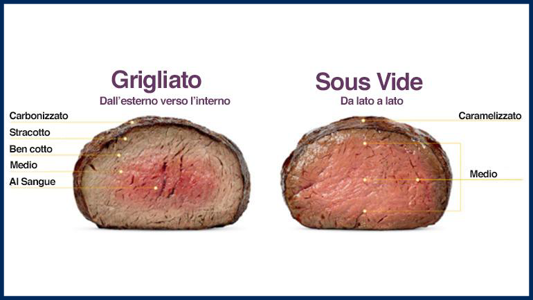 Se utilizzato nella maniera più corretta e accurata, questo metodo di cottura consente di esaltare i sapori e preservare le proprietà nutritive dell’alimento, ottenendo una consistenza perfetta e uniforme. Questo aspetto è di duplice importanza perché tiene conto e valorizza due cose fondamentali: il gusto e il contenuto nutrizionale. E se parliamo di carni è ancora più significativo perché sappiamo benissimo che una cottura sbagliata e troppo forte delle carni sviluppa delle sostanze tossiche e cancerogene sull’alimento, chiamate ammine eterocicliche, come avviene inesorabilmente nella cottura alla brace o alla griglia. Pertanto si può riuscire a preservare l’aspetto salutistico con le cotture più adeguate. Qui nella immagine si può vedere un esempio concreto per quanto riguarda la carne di manzo cotta con il metodo CBT e con metodo tradizionale alla griglia. È evidente la differenza sia nell’aspetto che nelle caratteristiche nutritive e organolettiche nei due tagli di carne.