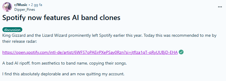 I brani risultavano credibilmente simili agli originali, tanto da far pensare che chi li avesse generati avesse semplicemente fornito a un modello IA i testi e qualche riferimento musicale, chiedendo poi di imitare lo stile della band. «Una brutta imitazione dell’Intelligenza Artificiale – commentava l’autore del post su Reddit – dall’estetica al nome della band, fino alla copia delle loro canzoni. Trovo tutto questo assolutamente deplorevole e chiuderò il mio account su Spotify».