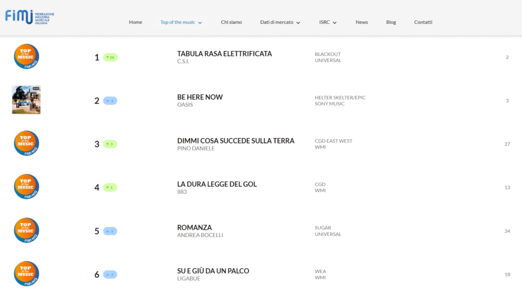 Il primo posto in classifica arrivò superando in un colpo solo gente come Ligabue, Andrea Bocelli, Pino Daniele, gli 883 e persino gli Oasis di Be Here Now. Un risultato talmente assurdo che all’inizio qualcuno non ci credette. Nei giorni successivi si parlò di un errore nel conteggio delle copie, causato dal codice a barre di Tabula Rasa Elettrificata, troppo simile a quello del singolo Candle in the Wind di Elton John, ristampato da poco dopo la morte di Lady Diana. Forse oggi qualcuno avrebbe urlato al complotto. Invece non c’era nessun errore, i C.S.I. erano davvero primi.