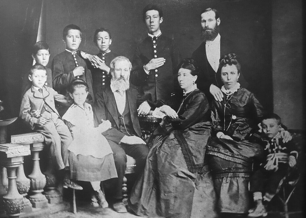 I Čechov nel 1874: Anton è il secondo in piedi a sinistra. A destra, uno zio con la moglie e il figlio.