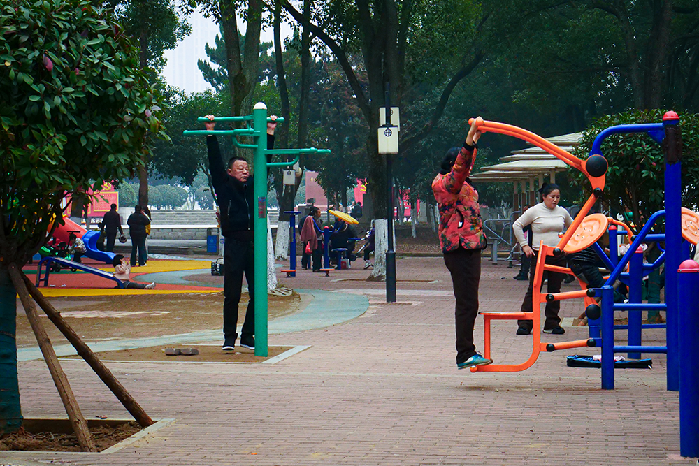 Nei parchi, lungo le rive dei fiumi o davanti agli ingressi dei templi, decine di anziani in vari momenti della giornata si incontrano per praticare insieme esercizi di fitness, tai chi quan e attività fisica leggera. All’alba, al calar del sole o alla fioca luce dei lampioni gruppi di uomini e donne cinesi mettono in pratica quella che ormai sembra essere divenuta una consuetudine approvata anche dall’Amministrazione generale dello sport cinese, uno degli organi della Repubblica Popolare dedicati alla pratica sportiva. La cura del benessere e della salute attraverso lo sport è diventata una priorità statale già da alcuni anni: dal 2009, infatti, è stata istituita la Giornata nazionale del Fitness, esattamente un anno dopo l’inaugurazione dei Giochi Olimpici di Pechino, celebrata nella data propizia dell’8 agosto del 2008. In occasione dell’istituzione di questa ricorrenza, l’ente statale che si occupa di sport ha stilato un programma normativo sul fitness, basato sulla diffusione e l’incentivo della pratica sia da un punto di vista sociale che da un punto di vista infrastrutturale. Nel corso degli anni, le istituzioni locali hanno investito per permettere a un numero sempre maggiore di persone di avvicinarsi allo sport, costruendo spazi pubblici dedicati, installazioni e strumenti collocati all’interno dei parchi per poter diversificare l’attività e suggerire circuiti funzionali al mantenimento del benessere.