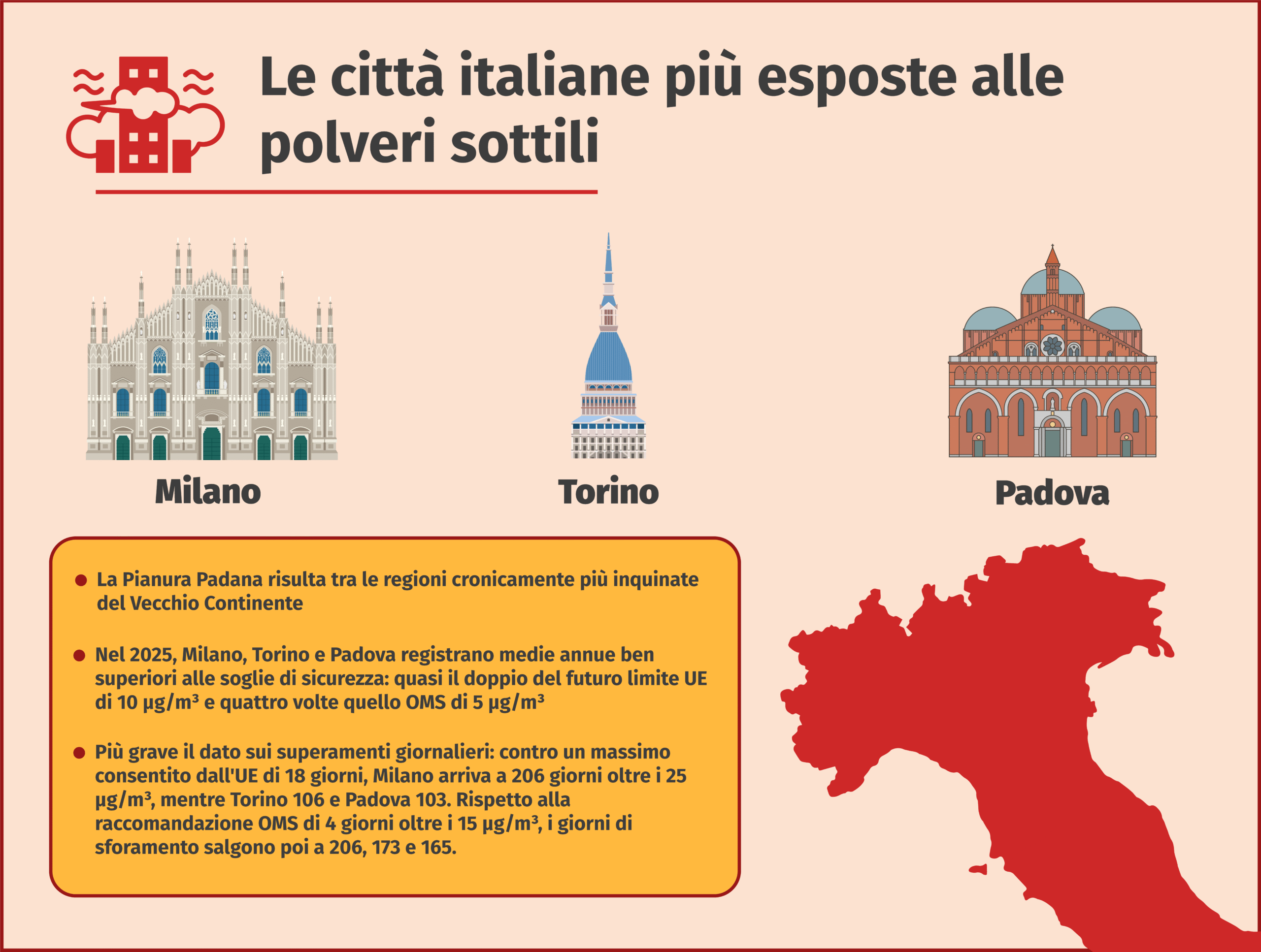 Guardando direttamente ai centri urbani italiani, anche l’ultima analisi del Joint Research Centre dell’UE evidenzia che il margine di miglioramento nelle nostre città è ancora ampio e che le misure adottate finora non hanno prodotto una riduzione dell’impatto sanitario paragonabile a quella osservata in altri Paesi. E a confermarlo ci sono i dati raccolti in 57 stazioni di monitoraggio in 27 città italiane dal progetto Cambiamo Aria di ISDE – Medici per l’Ambiente. Nel 2025, Milano, Torino e Padova registrano medie annue ben superiori alle soglie di sicurezza: quasi il doppio del futuro limite UE di 10 µg/m³ e quattro volte quello OMS di 5 µg/m³. Ancora più grave il dato sui superamenti giornalieri: contro un massimo consentito dall’UE di 18 giorni, Milano arriva a 206 giorni oltre i 25 µg/m³, mentre Torino 106 e Padova 103. Rispetto alla raccomandazione OMS di 4 giorni oltre i 15 µg/m³, i giorni di sforamento salgono poi a 206, 173 e 165 rispettivamente per le tre città, non a caso, tutte geograficamente padane. La Pianura Padana rappresenta infatti il cuore della crisi italiana della qualità dell’aria, nonché tra le regioni cronicamente più inquinate di tutto il Vecchio Continente. In un’area che ospita circa il 30% della popolazione nazionale e una quota rilevante del PIL, si concentrano contemporaneamente traffico intenso, un’elevatissima densità industriale, riscaldamenti civili ancora largamente basati su combustibili fossili e biomasse, e un sistema agricolo-zootecnico tra i più intensivi d’Europa. A rendere il quadro particolarmente critico vi è inoltre la conformazione orografica della Pianura – con a nord e a ovest le Alpi e a sud gli Appennini, e con l’unico sbocco naturale a est – per cui nei mesi invernali le frequenti inversioni termiche intrappolano l’aria fredda vicino al suolo, stabilizzando l’atmosfera e favorendo l’accumulo di inquinanti.