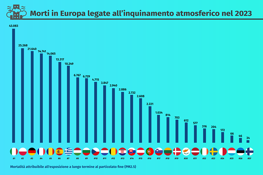 L’Italia è il Paese europeo con il più alto numero assoluto di morti attribuibili all’inquinamento atmosferico da polveri sottili PM2,5. Con 43.083 decessi stimati, il nostro Paese distanzia nettamente tutti gli altri Stati europei. Il secondo in classifica, la Polonia, si ferma a circa 25 mila morti, mentre la Germania segue con poco più di 21 mila. Un divario enorme, certificato dal rapporto Harm to human health from air pollution in Europe: burden of disease status, 2025, dell’Agenzia Europea dell’Ambiente (EEA). Il documento – come già approfondito in un precedente articolo – segnala anche che a livello europeo, dal 2005 al 2023, i decessi prematuri attribuibili al particolato fine PM2,5 si sono ridotti del 57%. Una nota positiva che tuttavia non sana la drammatica, e dai più ignorata, situazione nel nostro Paese.