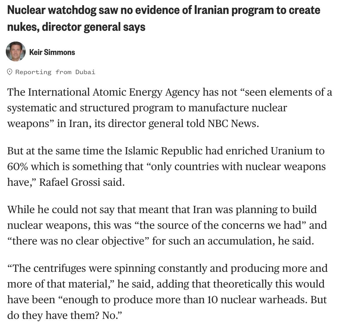 Grossi lo ha detto chiaro due volte, la prima in una intervista alla NBC: l’AIEA “non ha riscontrato elementi di un sistematico e strutturato programma di produzione di armi nucleari”. Lo ha poi ribadito chiaro in un tweet: “non vi sono prove che l’Iran stia costruendo una bomba nucleare”. Quello che preoccupa, riferisce il capo dell’AIEA, sono “le ingenti scorte di uranio arricchito“. Anche se questo “desta preoccupazioni”, non significa che l’Iran stia programmando di creare l’arma nucleare, ha specificato Grossi. Parole pressochè identiche a quelle pronunciate lo scorso giugno, quando l’agenzia smentiva l’esistenza di una minaccia reale iraniana in questo senso, contraddicendo quanto sostenuto dall’occidente – e da trent’anni di menzogne di Israele in merito.