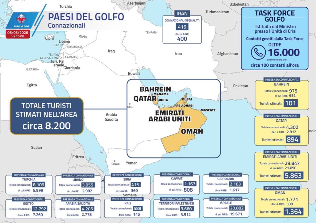 La Farnesina ha creato la “Task Force Golfo” per assistere i connazionali bloccati nella regione.