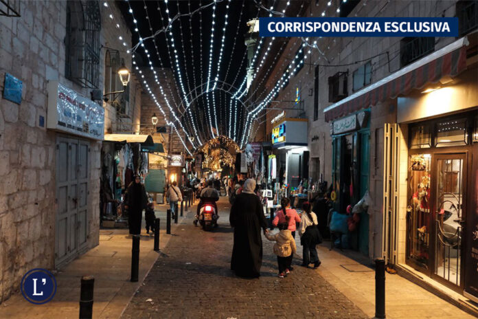 BETLEMME, PALESTINA OCCUPATA – Il Natale è tornato a Betlemme, dopo due anni in cui le autorità locali avevano deciso di sospendere le celebrazioni in solidarietà alla popolazione palestinese della Striscia. Uno dei luoghi simbolo dell’identità cristiana, dove nacque Gesù Cristo, è tornato a risplendere in questi giorni, dopo due anni di buio, dove l’assenza di fedeli e turisti pesa enormemente sull’economia cittadina. Sono centinaia le persone che si sono radunate la sera del 24 dicembre nella piazza della Mangiatoia, davanti la Basilica della Natività, dopo una processione per le vie della città. Un concerto dal vivo, banchetti, e un enorme albero di Natale ha accompagnato i credenti riuniti per celebrare il Natale per la prima volta dall’inizio dal ottobre 2023. Un’evento che accende la luce sulla comunità palestinese di religione cristiana, circa 50.000 persone che da secoli vivono in pace con la comunità musulmana ed oggi soffrono, come tutti i palestinesi, le violenze della polizia e dei coloni israeliani, che non si sono placate nemmeno nei giorni del Natale.