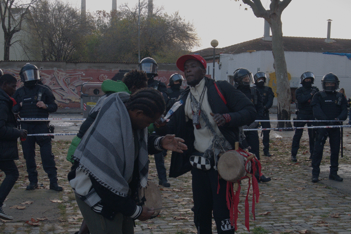 “Stanno facendo controlli a manetta” mi racconta un militante, mentre seguiamo il percorso del corteo tra giovani, anziani e famiglie. “All’altezza di Porta Palazzo [il mercato centrale di Torino, a pochi km dal centro sociale, ndr] gli agenti in borghese sono saliti sui tram, hanno fatto chiudere le porte e hanno chiesto i documenti a tutti, indiscriminatamente. Stessa cosa con le persone in arrivo alla stazione di Porta Nuova”. Ogni accesso alle vie del quartiere Vanchiglia è bloccato da due camionette e da qualche decina di agenti in tenuta antisommossa. Le principali arterie di questa zona della città – corso Regina, corso San Maurizio, via Vanchiglia e tutte le strade circostanti – sono bloccate da agenti, camionette e, in qualche punto, anche camion-idranti. Molta è la rabbia tra gli esercenti: “Questore, viene lei a distribuire tutti i pacchi che ho da consegnare in negozio?” chiede qualcuno sui social.