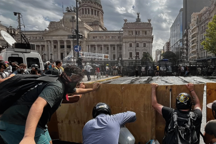 Mentre dentro le sale del Senato si discuteva la proposta di legge, fuori i cittadini scatenavano una rivolta. Arrivati davanti alla piazza del Congresso, sono scoppiati violenti scontri tra manifestanti e forze dell’ordine, che hanno portato all’arresto di 71 persone. Le ricostruzioni mediatiche riportano di una vera e propria «battaglia campale», con i manifestanti che hanno lanciato molotov, pietre, e vasi contro le forze dell’ordine, trincerandosi dietro a improvvisati scudi di legno. La guerriglia si è interrotta quando gli agenti hanno caricato i gruppi di manifestanti in piazza, supportati da scudi, manganelli e idranti. I media parlano di almeno 12 feriti tra le forze di polizia, mentre rimane ignoto il numero di manifestanti rimasti lesi; dalle foto e dalle denunce di sindacati e movimenti è tuttavia certo che ve ne siano stati. I medesimi, denunciano l’impiego di gas lacrimogeni che avrebbero colpito indiscriminatamente centinaia di dimostranti, l’arresto di decine persone ancor prima dell’inizio della marcia, l’uso di proiettili di gomma, e il tentativo di impedire alle ambulanze di raggiungere e trattare i dimostranti rimasti feriti.
