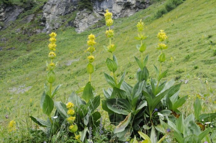In Italia, particolarmente critica è la situazione della genziana. Negli ultimi anni le popolazioni naturali di questa specie hanno registrato una contrazione significativa sia sulle Alpi sia lungo l’Appennino, nonostante la specie sia protetta e inserita nell’Allegato V della Direttiva UE Habitat (92/43/CEE), che regola il prelievo delle radici in natura per uso erboristico e commerciale. Il caso più allarmante riguarda la Sardegna, dove studi condotti tra il 2016 e il 2023 classificano la specie come “in pericolo” a causa della riduzione della qualità dell’habitat. A livello nazionale, secondo i dati IUCN, alcune regioni mediterranee potrebbero registrare entro il 2050-2070 una riduzione dell’areale superiore al 50%. La situazione appare ancora più rilevante se si considera il peso economico del settore. In Italia il comparto delle piante officinali muove infatti un mercato superiore al miliardo di euro. Nel Paese si contano circa 9.000 ettari coltivati, i quali interessano circa 130 specie coltivate e 430-450 produttori specializzati. Il Piemonte rappresenta la regione leader per coltivazione e produzione, con circa 750 ettari. Tra le aree più note spicca Pancalieri, tra Cuneo e Torino, storicamente legata alla coltivazione di menta piperita, ma anche di melissa, salvia, camomilla, assenzio ed echinacea. Importanti distretti produttivi sono presenti anche in Toscana, Marche, Puglia, Emilia-Romagna e Lombardia. La distribuzione naturale delle piante officinali segue invece le caratteristiche climatiche e ambientali della penisola. Le regioni del centro-sud e le isole maggiori, grazie al clima mediterraneo e ai suoli ben drenati, ospitano numerose specie aromatiche spontanee. In Sicilia, ad esempio, crescono origano, rosmarino, timo, cappero e finocchietto selvatico, mentre in Sardegna sono diffusi mirto, elicriso e lentisco. Ugualmente Calabria, Puglia e Basilicata, dove è altrettanto presente la macchia mediterranea costiera ricca di specie da millenni utilizzate dall’uomo per vari scopi. L’Arco Alpino e l’Appennino garantiscono invece la presenza, spesso all’interno di aree protette, di specie tipiche degli ambienti montani, prime fra tutte arnica e genziana.