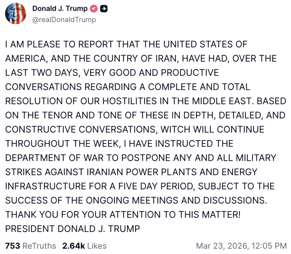 Secondo quanto scritto da Trump sul suo profilo Truth, gli Stati Uniti e l’Iran avrebbero concluso una due giorni di colloqui positivi, per porre fine alla guerra in Asia Occidentale. In base a ciò, e in attesa di ulteriori sviluppi, il presidente USA ha «istruito il Dipartimento della Difesa di rinviare tutti gli attacchi militari contro le strutture energetiche e le centrali elettriche iraniane per cinque giorni».