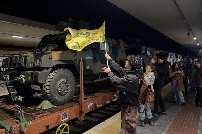 Si è concluso con una vittoria il presidio creatosi ieri pomeriggio alla stazione di Pisa. «Dopo sei ore di blocco dei binari il treno è tornato indietro da dove è venuto», commentano le sigle promotrici: Movimento No Base, Collettivo di fabbrica GKN, Gruppo Autonomo Portuali Livorno e Rete Libere/i di lottare. Il convoglio composto da 32 vagoni carichi di munizioni, esplosivi e veicoli militari era partito dalle acciaierie Jindal Steel Work di Piombino, in direzione Udine. Dopo aver attraversato l’hub militare toscano — diffuso tra Pisa, Livorno e Pontedera — il treno è stato prima rallentato da un presidio dell’Unione Sindacale di Base (USB), per poi essere bloccato definitivamente nella stazione di Pisa. Si tratta di «un risultato decisivo della determinazione e la resistenza di tutti», dichiarano le sigle promotrici, lanciando un messaggio chiaro contro i sempre più forti venti di guerra: «Ovunque possiamo fermarli, in ogni città e in ogni paese. Oggi un primo passo, la pace si può realizzare con la lotta e la lotta continua».