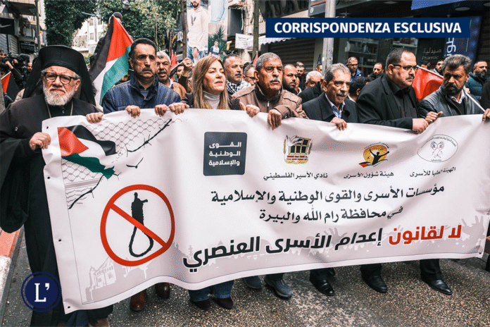 RAMALLAH, PALESTINA OCCUPATA – Negozi, attività, uffici: ieri, in tutte le città della Cisgiordania, così come nei piccoli paesi, si è tenuto uno sciopero generale che ha bloccato ogni genere di realtà, mentre a Ramallah centinaia di persone hanno sfilato in corteo. La protesta è stata chiamata da alcuni dei principali partiti politici contro la legge sulla condanna a morte approvata il 30 marzo dalla Knesset israeliana. Al fianco della Palestina, in tutto il mondo si sono mosse migliaia di persone, per protestare contro l’ennesima decisione di Israele che viola apertamente i diritti umani e il diritto internazionale: sit-in e marce hanno avuto luogo da Londra e Amsterdam fino ai campi profughi palestinesi del Libano, mentre numerose città siriane sono scese in piazza chiamando all’azione in solidarietà con il popolo palestinese. Centinaia di persone hanno marciato anche per le strade di Gaza, nonostante le difficili condizioni di vita date dal genocidio in corso.