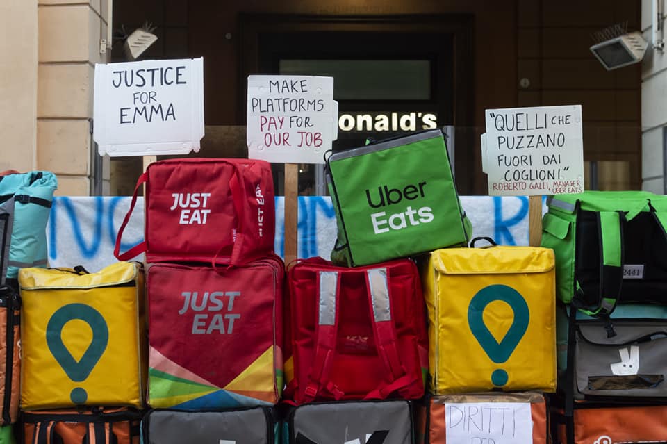 In Italia rimangono le briciole, anzi il saldo è negativo visto che le ingenti commissioni che i ristoratori pagano per il servizio di consegne a domicilio vengono detratte dalle imposte che i essi versano. Il tutto attraverso un sistema che si alimenta dello sfruttamento dei fattorini, inquadrati come collaboratori esterni, pagati a cottimo e senza tutele in caso di malattia ed infortunio.