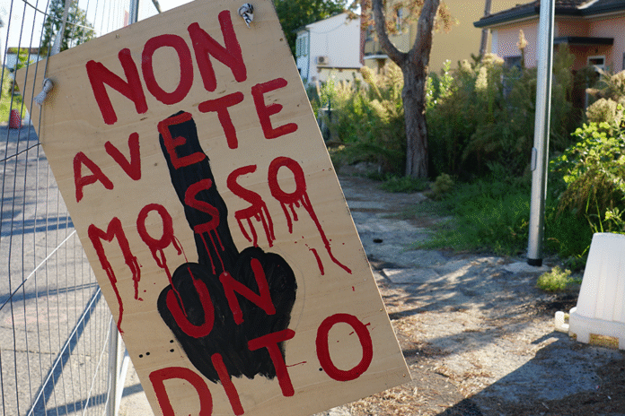 Traversara è un borgo di appena cinquecento anime, sprofondato nel cuore della bassa padana, nel comune di Bagnacavallo, provincia di Ravenna. Qui la pianura domina incontrastata. L’unico limite allo sguardo è l’argine del fiume, innalzato negli anni di decine di metri sopra le case per difenderle dalla furia dell’acqua. In via Torri una lunga fila di case è rimasta com’era un anno fa: muri sventrati, stanze a cielo aperto. È la cosiddetta “zona rossa”, tuttora inaccessibile. Dai varchi si scorgono materassi, sedie, termosifoni, biciclette, tavolini. Frammenti di vita quotidiana trasformati in un museo della catastrofe. Chi viveva lì è dovuto scappare senza poter prendere nulla e non è più tornato. A separare le abitazioni dalla strada c’è una recinzione metallica, su cui gli abitanti hanno appeso cartelli che gridano la loro rabbia e la loro frustrazione. Su uno si legge: «Noi viviamo sempre con la valigia pronta». Su un altro: «Voi non avete mosso un dito». Sotto la frase, il dito disegnato è il medio.