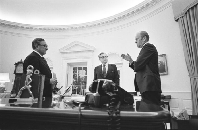Henry A. Kissinger nel 1975. In quell’anno, Kissinger era Segretario di Stato (il principale responsabile della politica estera USA) e fino a novembre anche Consigliere per la Sicurezza Nazionale. La carica di Segretario di Stato la mantenne dal 22 settembre 1973 al 20 gennaio 1977, sotto i presidenti Richard Nixon e Gerald Ford.